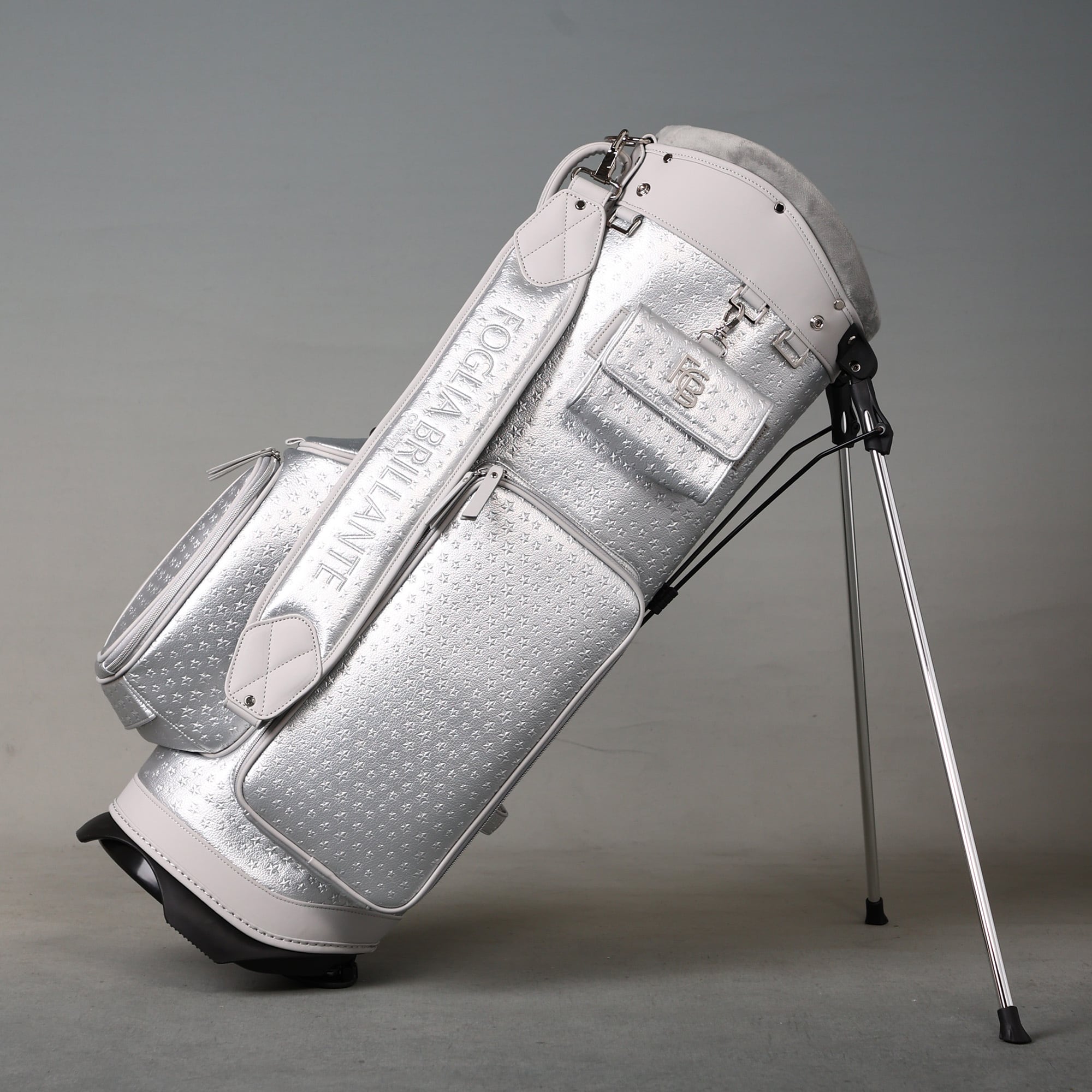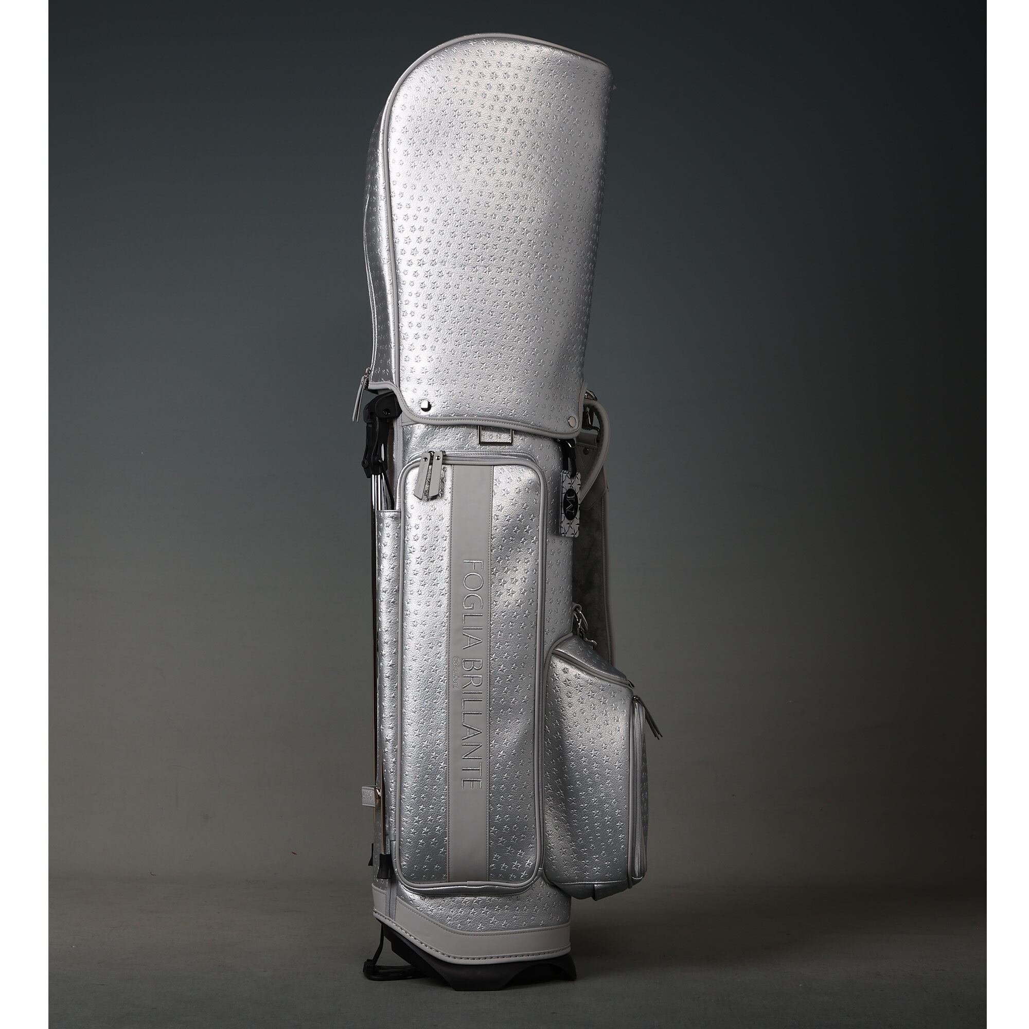シルバーの細かい星柄の型押し合皮素材で、全体をシックにまとめた、ラグジュアリーなキャディバッグ